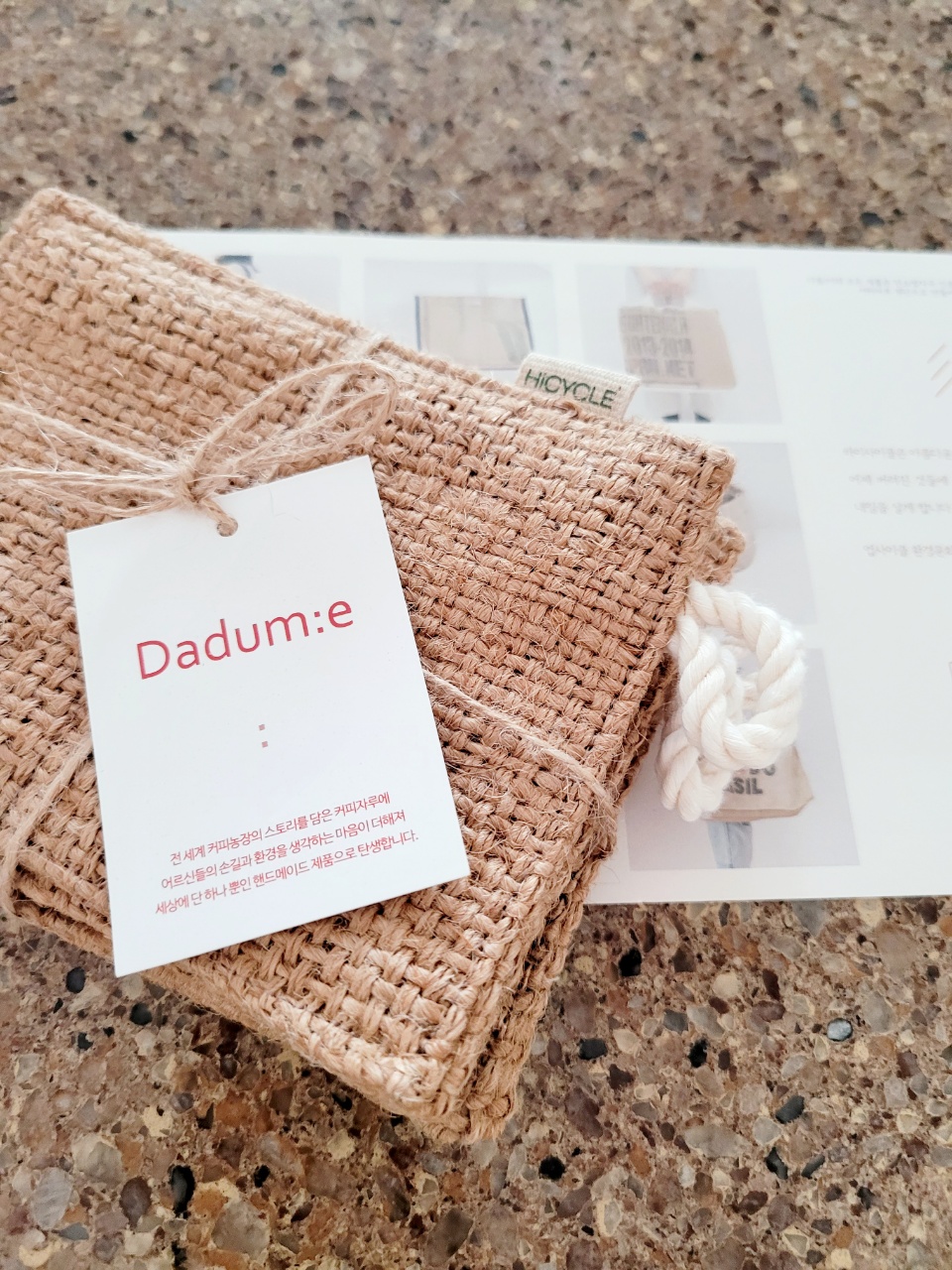 황마 줄기로 만들어져서 미세 플라스틱 걱정이 없으며 100% 생분해된다는 점이 마음에 든다. 그리고 하이사이클에서 만든 제품은 석유화학재료나 합성 재료 없이 천연소재 그대로 만들어 탄소발자국 인증받은 커피 자루 원단만 사용한다니 안전성에서도 믿음이 갔다.