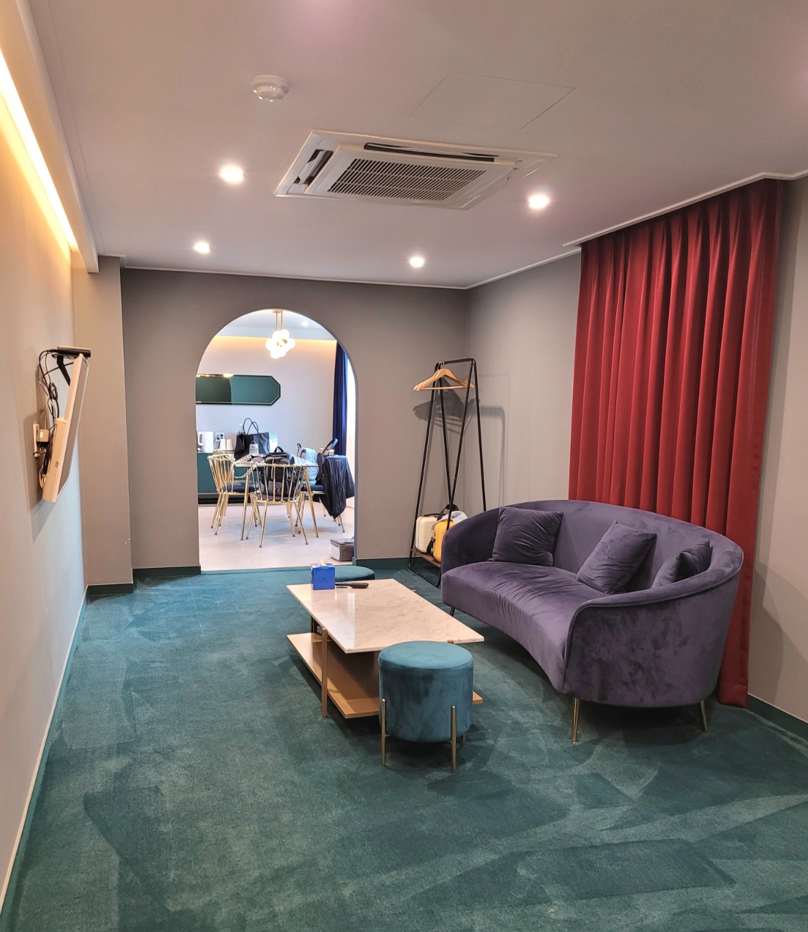 모텔인 듯 보이는 오래된 건물을 리모델링한 부티크호텔이라 가족들에게 큰 기대가 없기를 당부하며 도착했는데 사장님(?)께서 마중 나와 친절하게 주차안내를 해주시니 숙소의 첫인상이 좋아졌다.